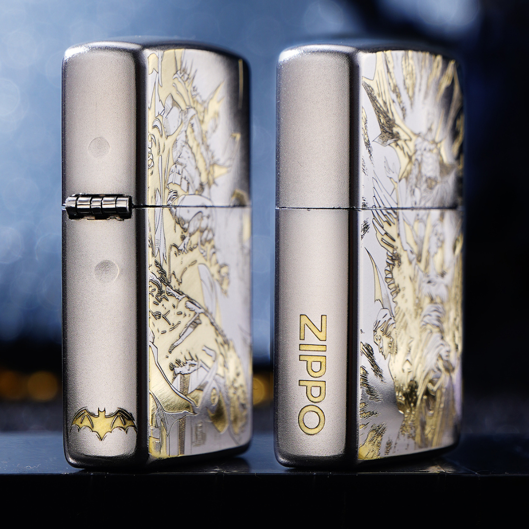 Featuring deep engraved artwork on both sides, this Zippo showcases dynamic comic-style illustrations of Batman in action, enhanced with gold-tone highlights for a dramatic, high-contrast finish. The artwork captures the dark, powerful aesthetic of Gotham’s protector with exceptional detail.