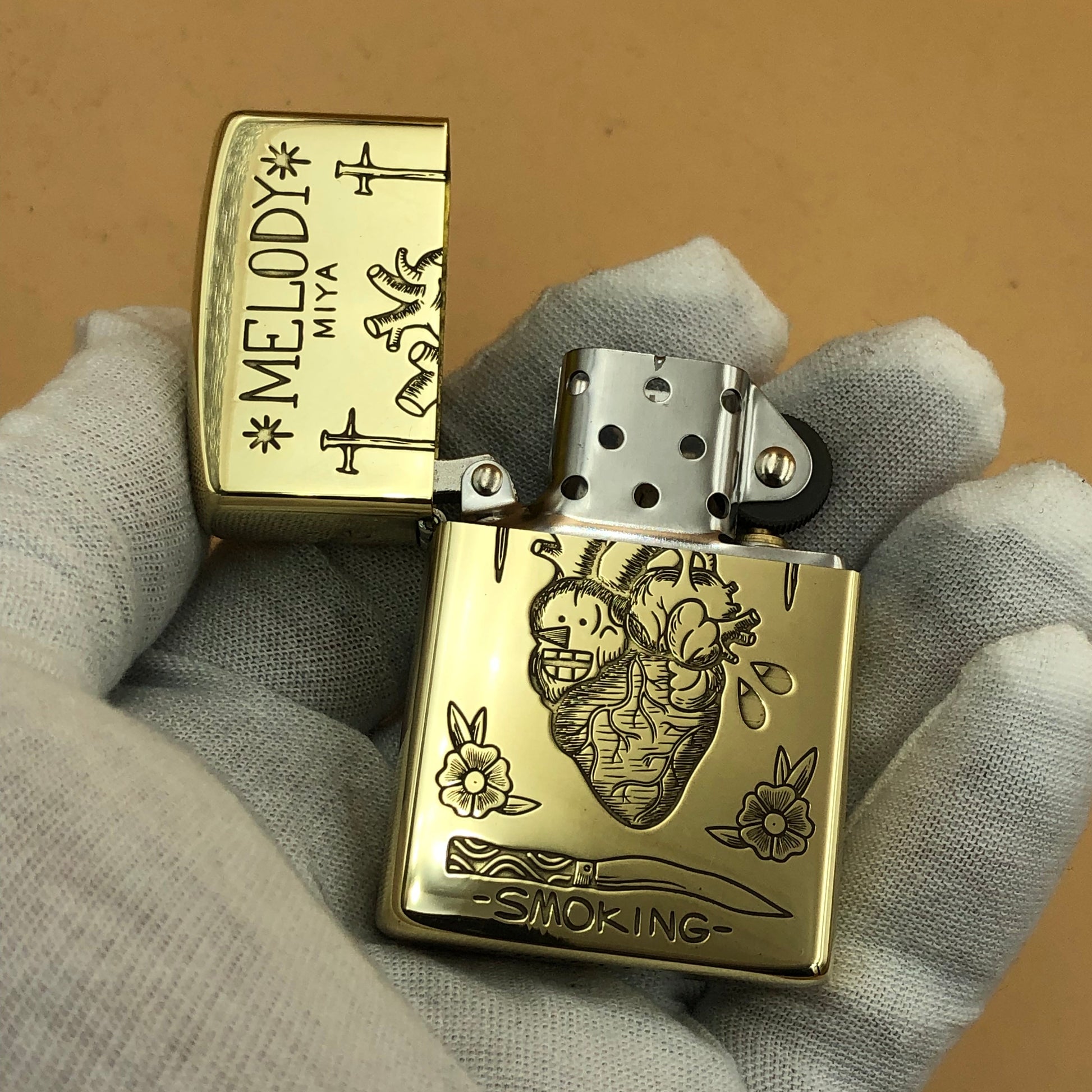 This custom Zorro Brass lighter features bold, artistic engravings inspired by playing card symbolism and tattoo-style illustration. Crafted using deep engraving techniques, the design is carved directly into the solid brass surface for maximum durability, contrast, and a premium handcrafted feel.