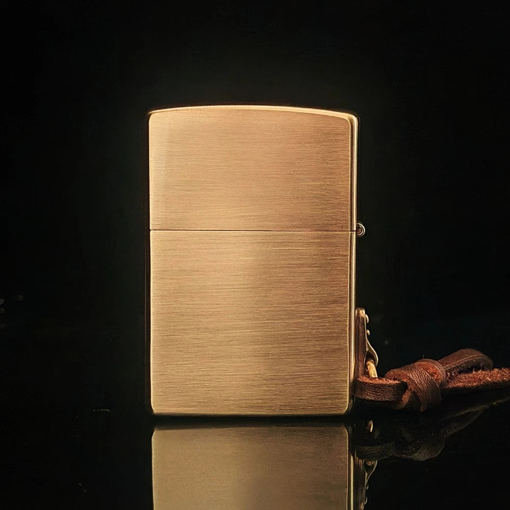The brushed brass body gives it a refined, vintage look, while the back remains clean and smooth for a minimalist contrast. Built in the USA, this lighter delivers the iconic Zippo reliability, windproof flame, and unmistakable “click” that collectors value. The attached leather strap adds charm and makes it a great everyday carry accessory.
