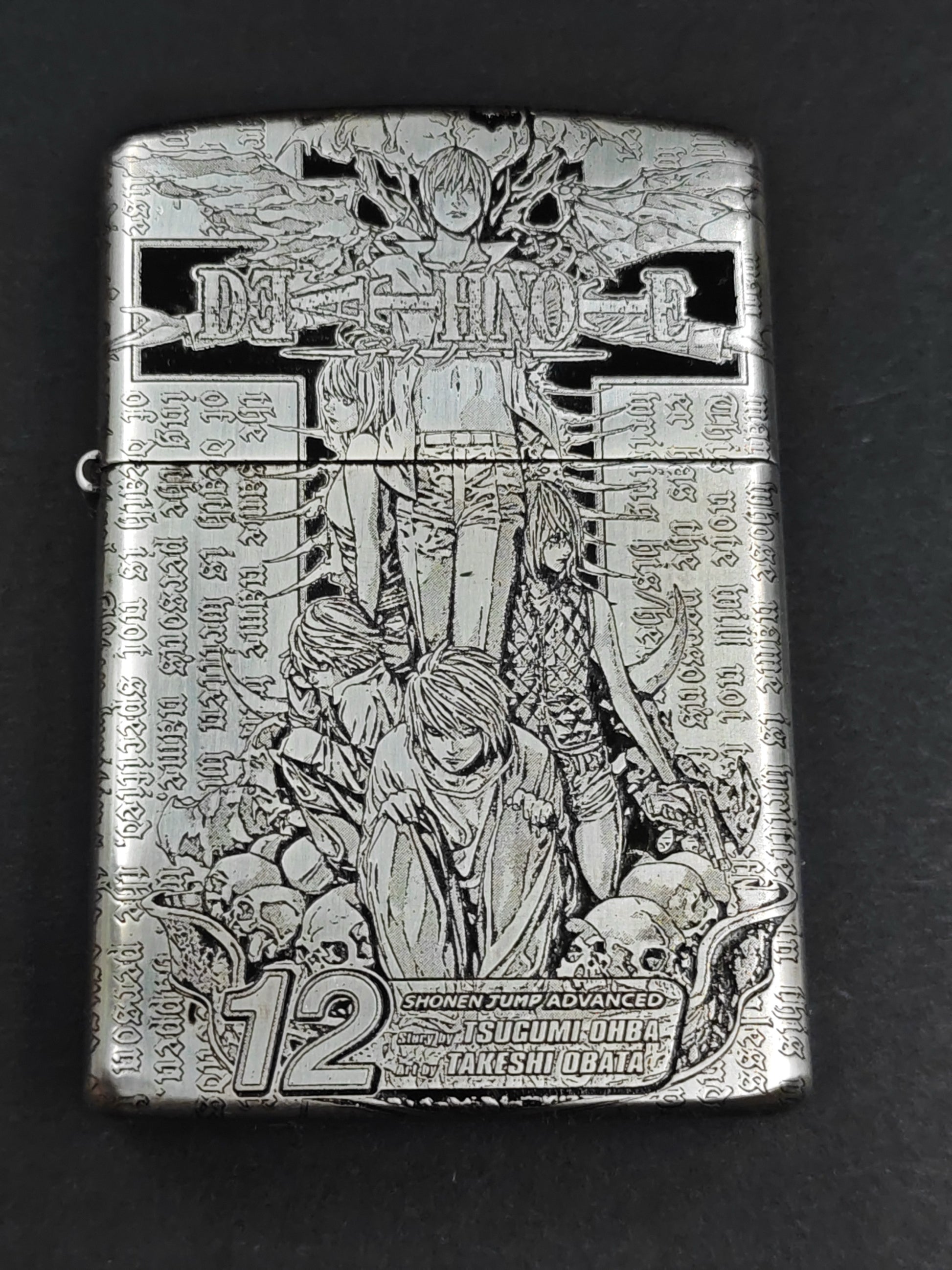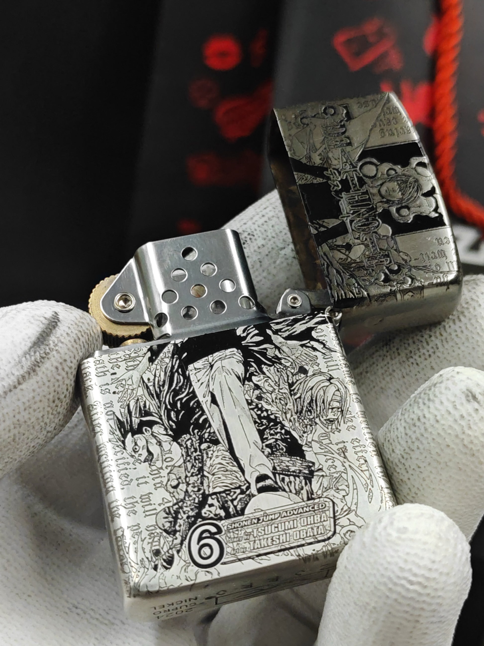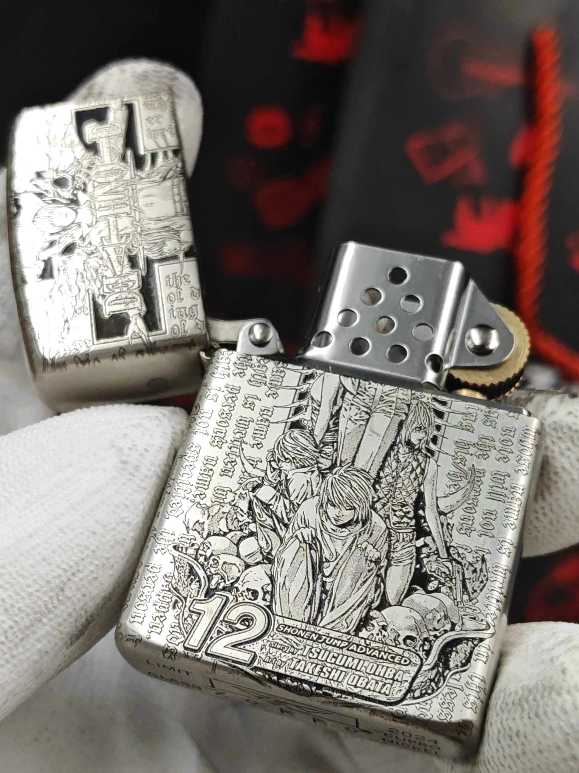 This Zorro White Copper lighter is a Limited Edition collectible, crafted from a solid copper-nickel alloy and featuring deep laser engravings inspired by the Death Note manga series. The intricate etching captures an authentic Japanese comic aesthetic with remarkable precision and high contrast.