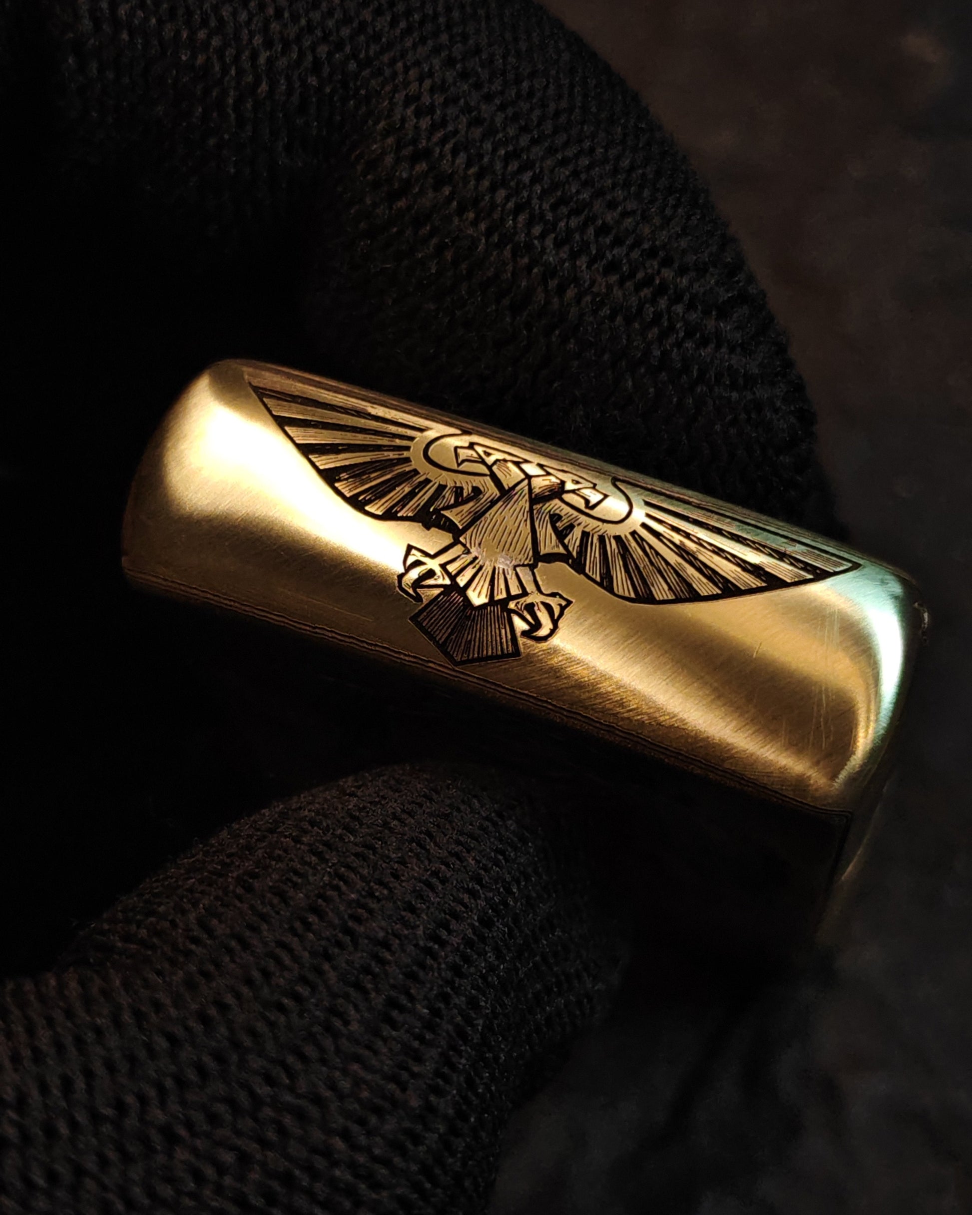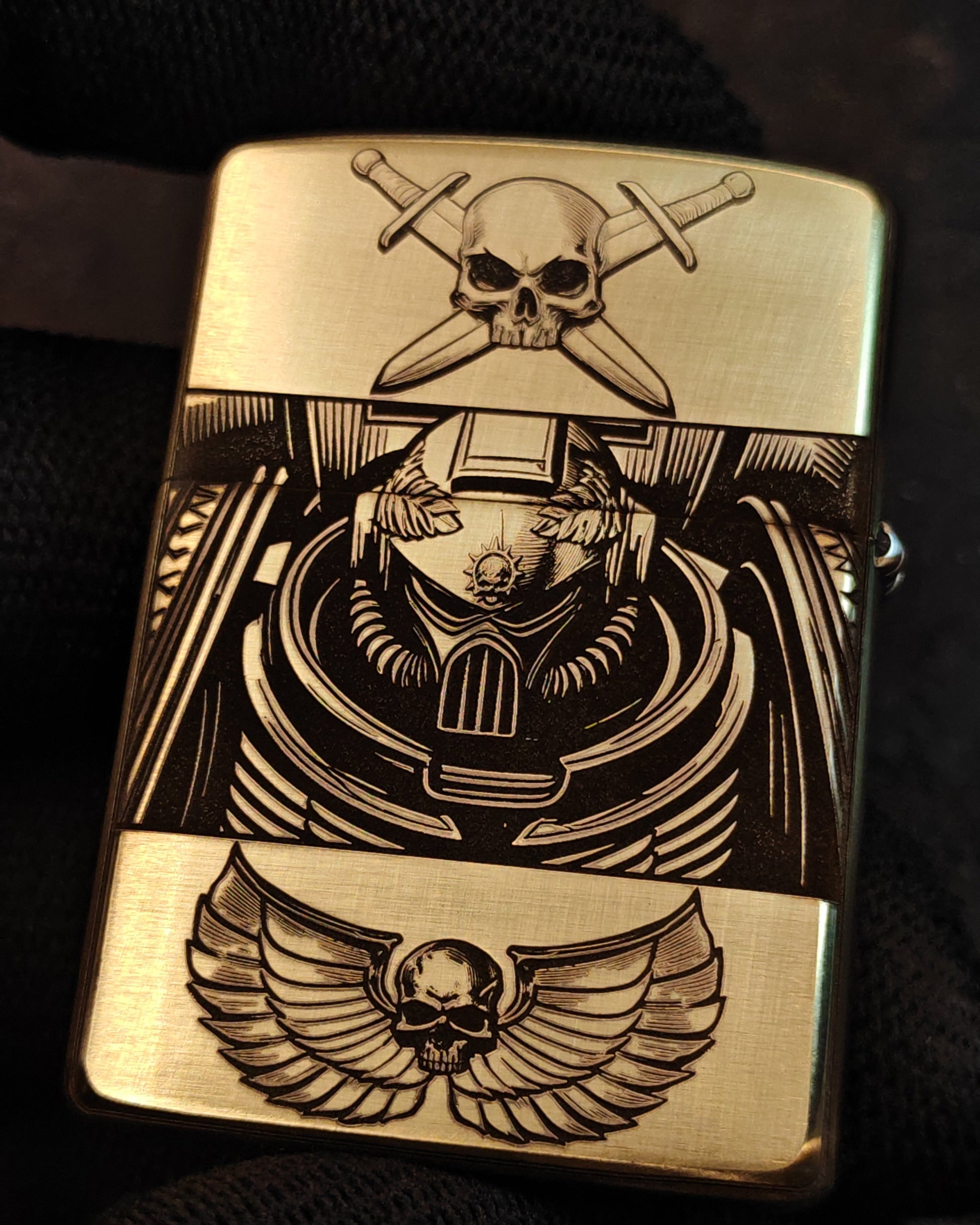 This Armor Brass Zippo lighter features a striking fine deep carving design inspired by the Warhammer 40K universe, drawing clear influence from the iconic Space Marine aesthetic. Crafted from solid brass with a premium Armor® case, it offers a heavier feel, enhanced durability, and a refined brushed finish that emphasizes the depth and precision of the engraving.