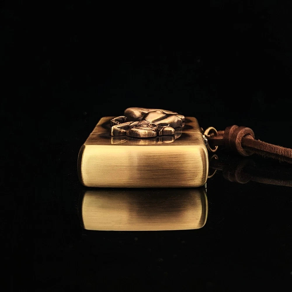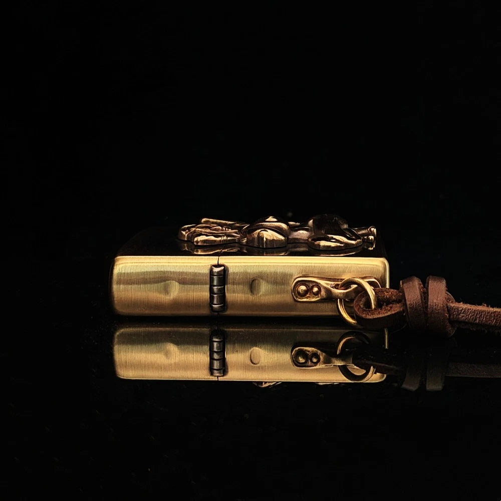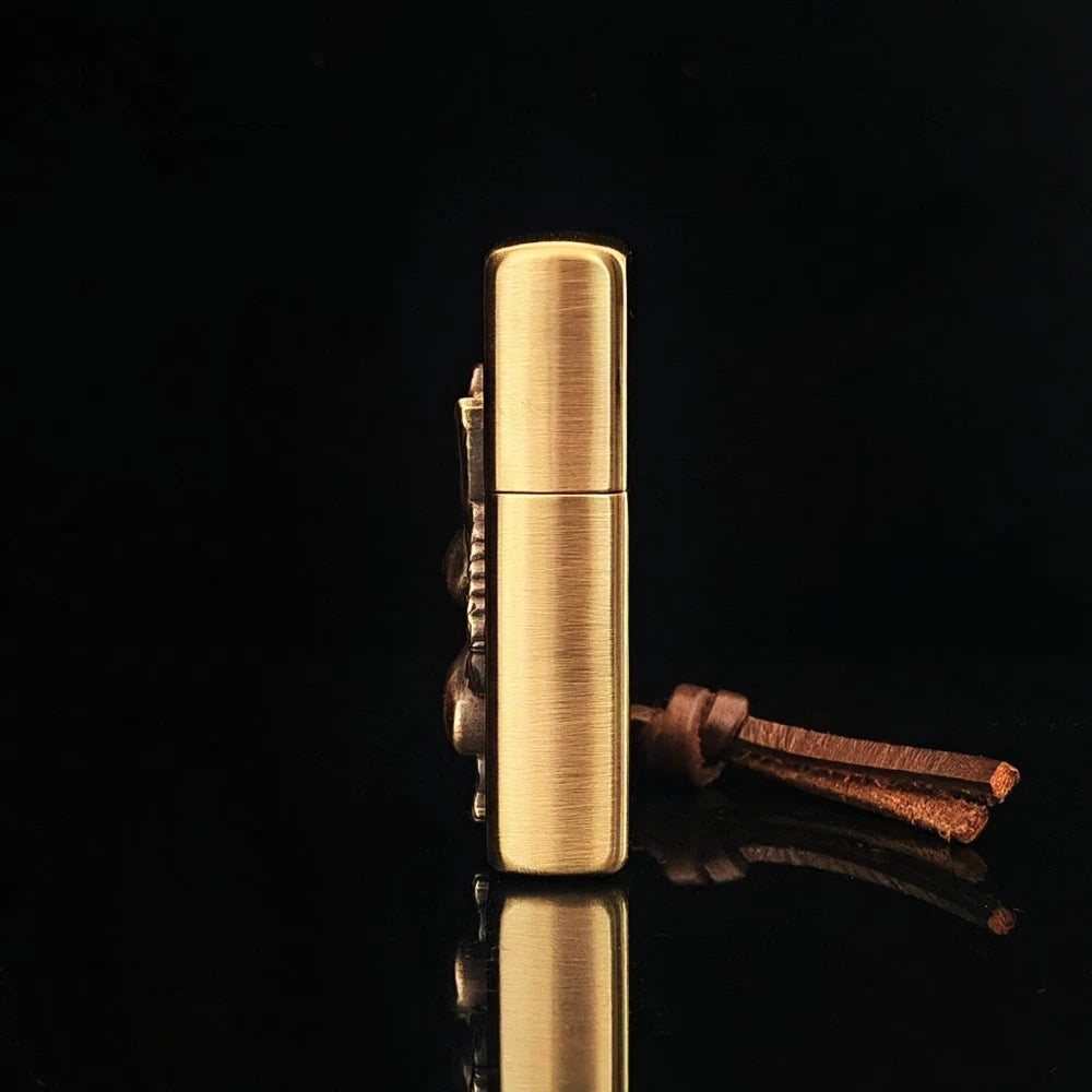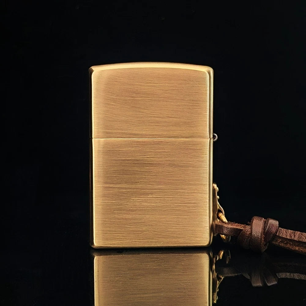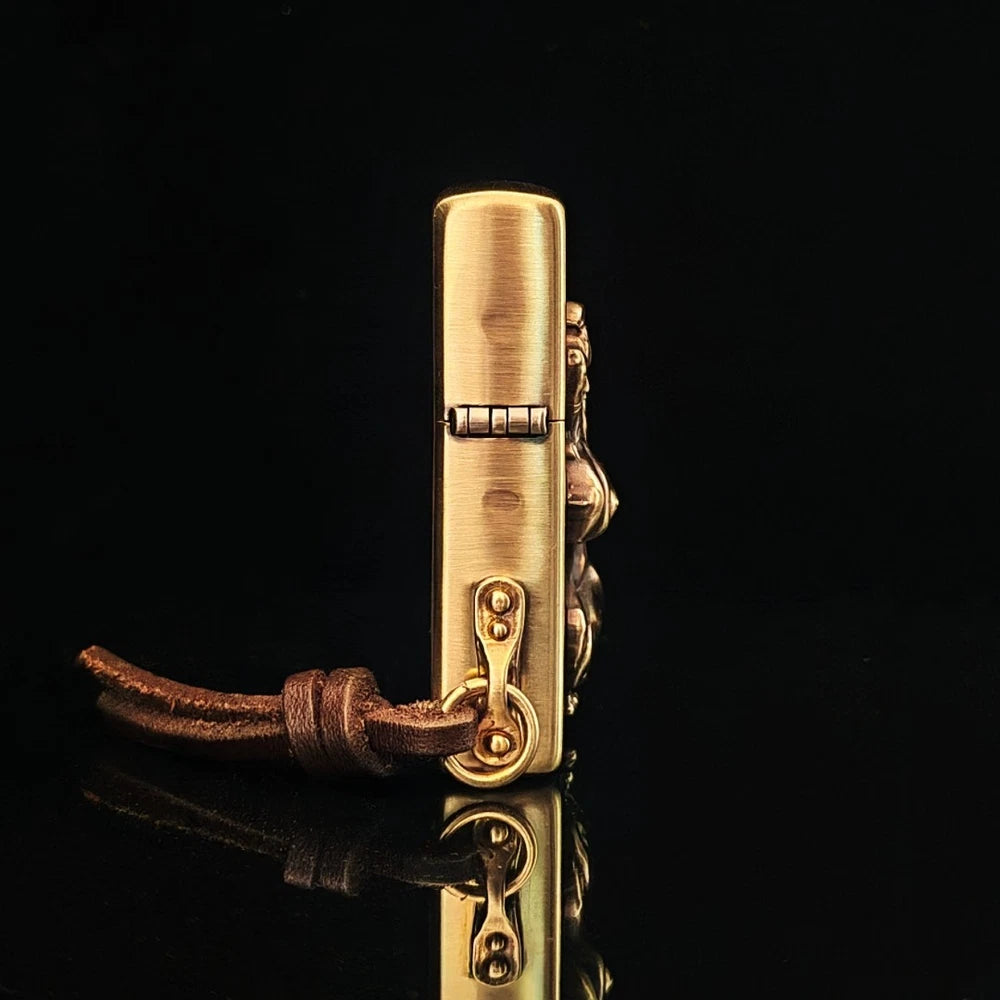 Crafted from solid brass with a warm brushed texture, this Zippo showcases a raised metal emblem depicting an artistic stylized military girl in high-relief sculpting. The emblem is cast in metal and securely mounted to ensure long-term durability. The back remains clean and undecorated, keeping a classic minimalist Zippo look, while the leather strap adds character and practicality.