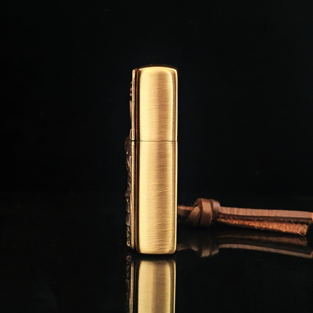 Crafted from solid brushed brass, the case offers a warm antique tone that beautifully complements the raised relief carving. The reverse side keeps the classic clean Zippo look, while the attached genuine leather strap adds both utility and Western character.