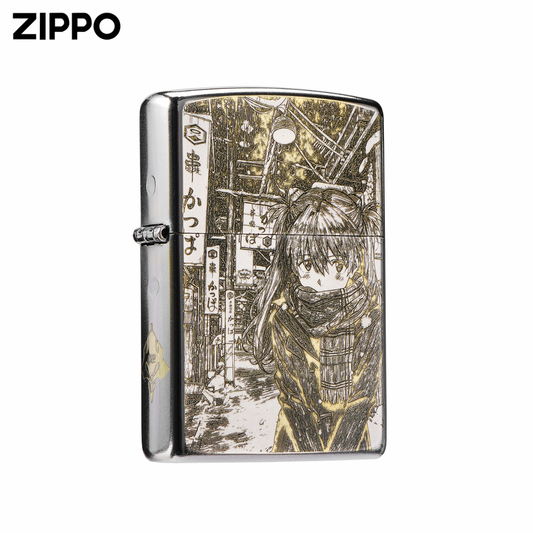 Featuring deeply engraved artwork with warm gold-tone highlights, this lighter captures two expressive manga-style scenes of Asuka: a joyful winter moment and a beautifully detailed urban setting.