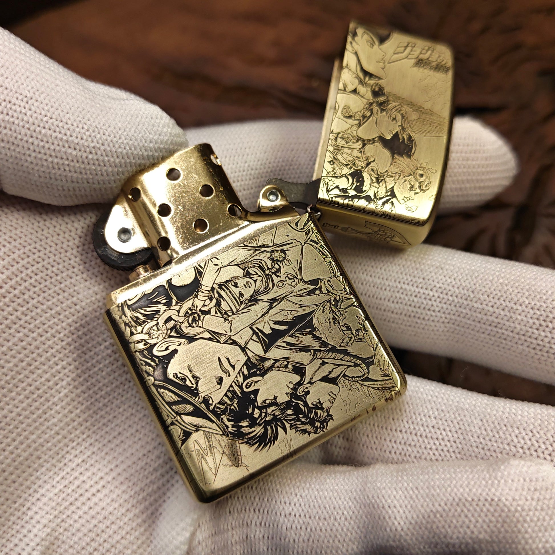 A Zippo Armor lighter featuring engraved artwork, inspired by Jojo's Bizare Adventure.