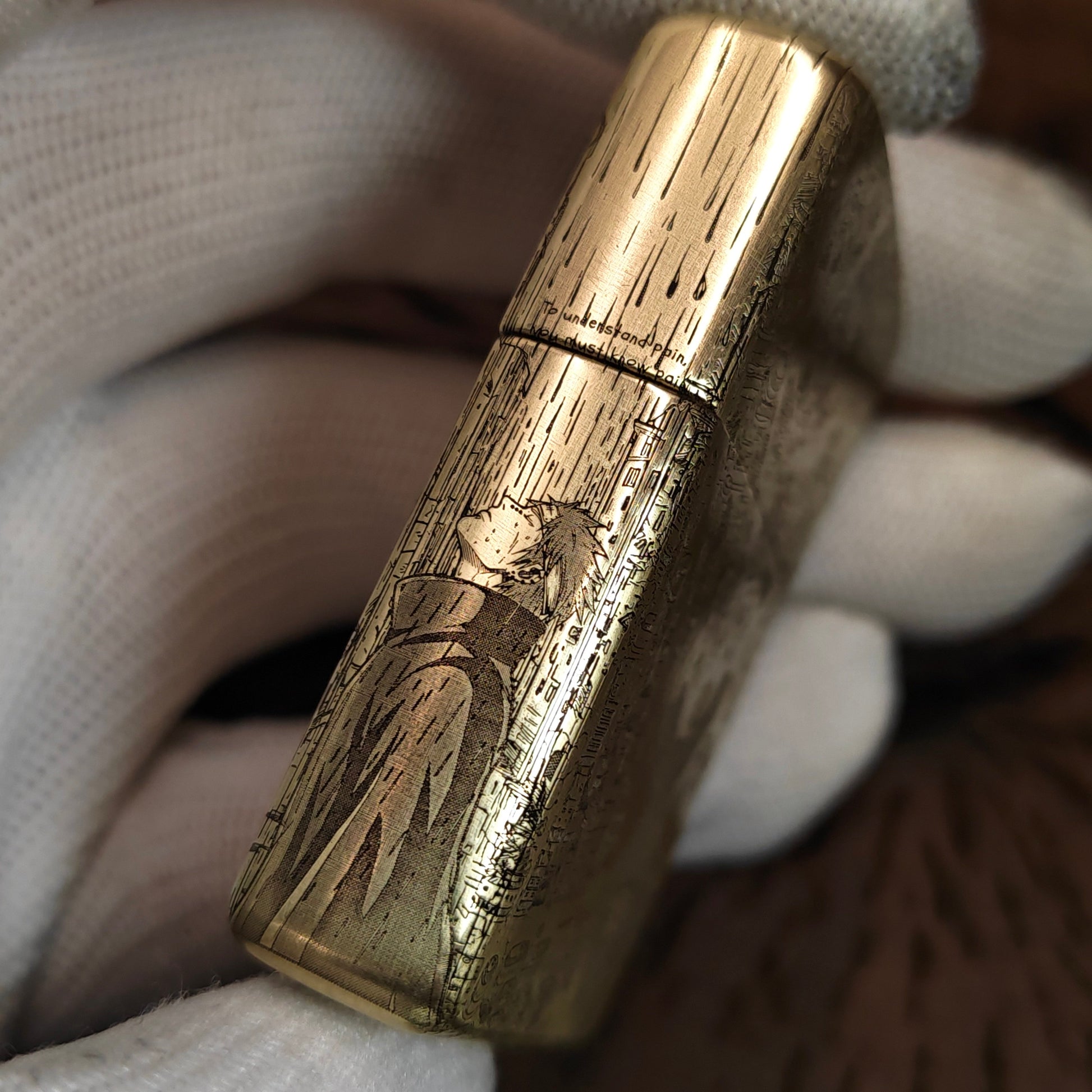 A Zippo Armor lighter featuring engraved artwork, inspired by Pain.