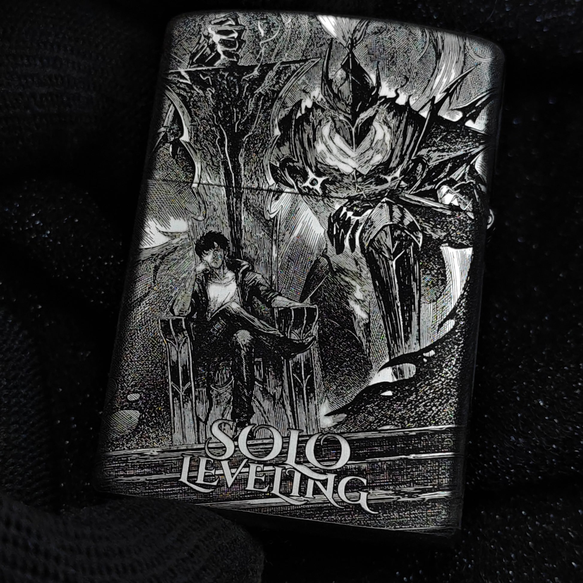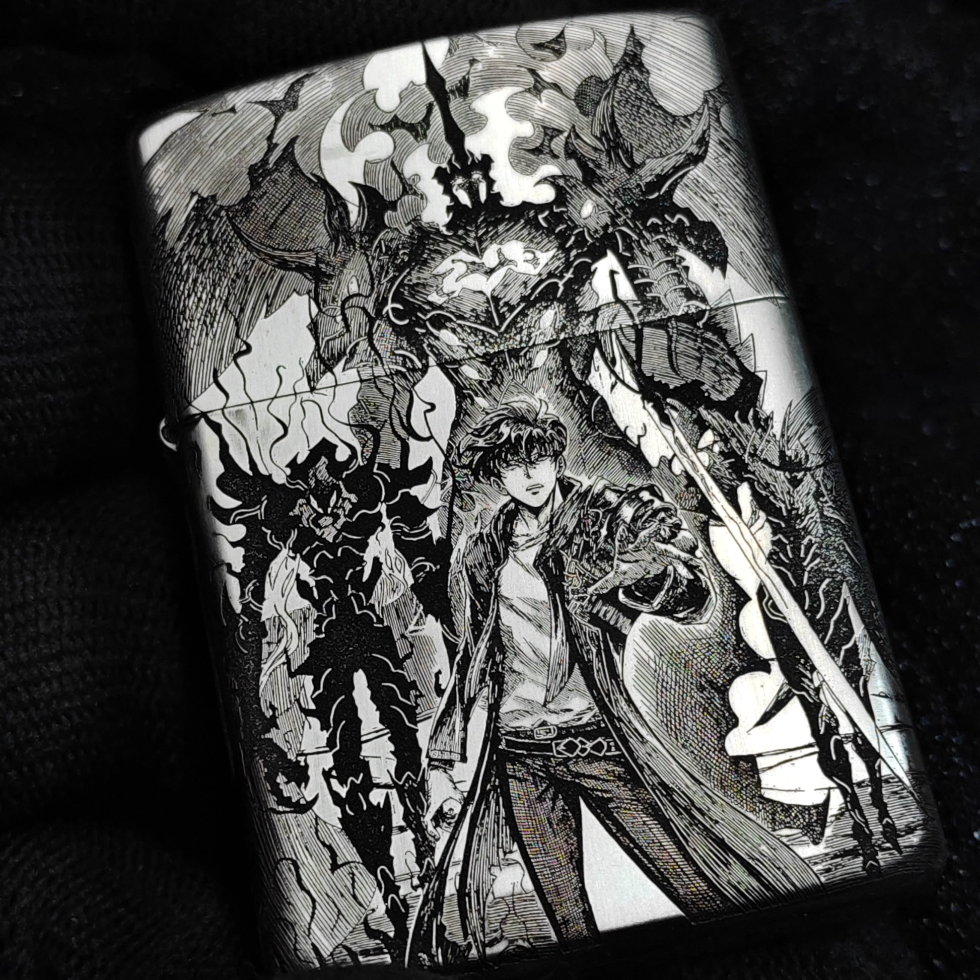 Unleash the power of ascension with this Zippo Street Chrome lighter, featuring an exclusive deep engraving inspired by Solo Leveling. Crafted with precision, this collectible lighter showcases iconic characters, symbols, and dramatic artwork engraved directly into the metal surface, creating a striking contrast between chrome and gold-toned details.